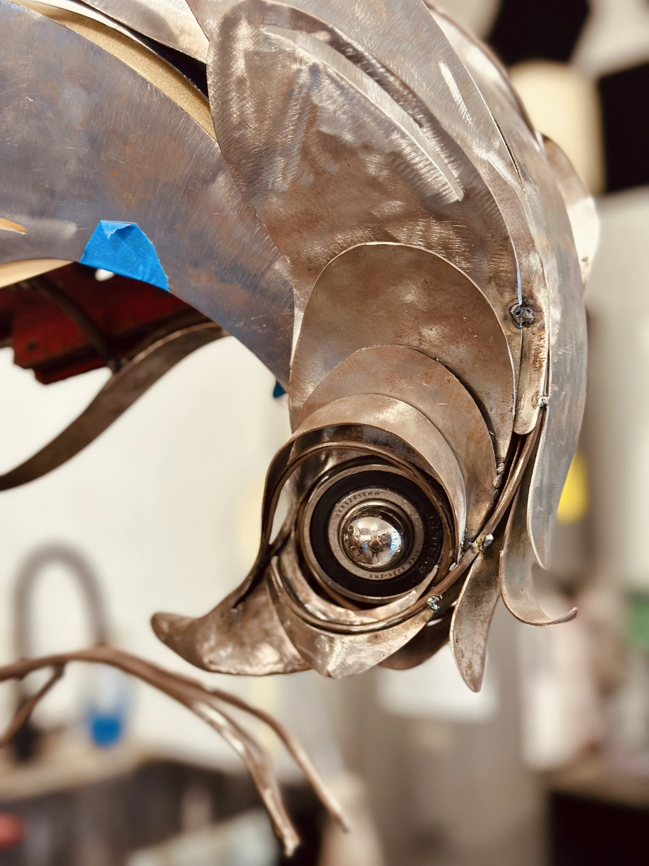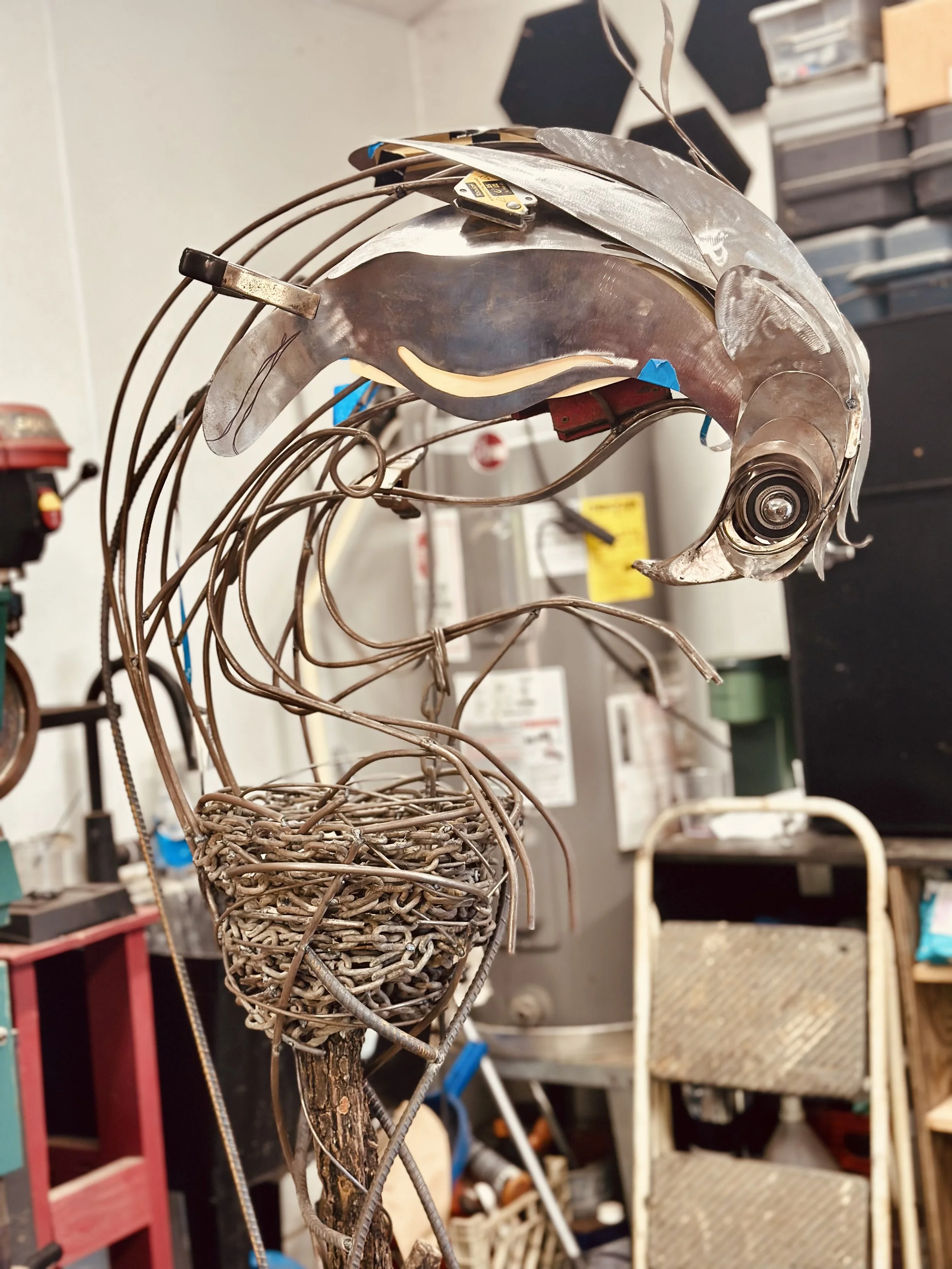 Steel, rebar, expanded metal, rods, mesquite branch, recycled steel, and vellum illuminated from the inside.